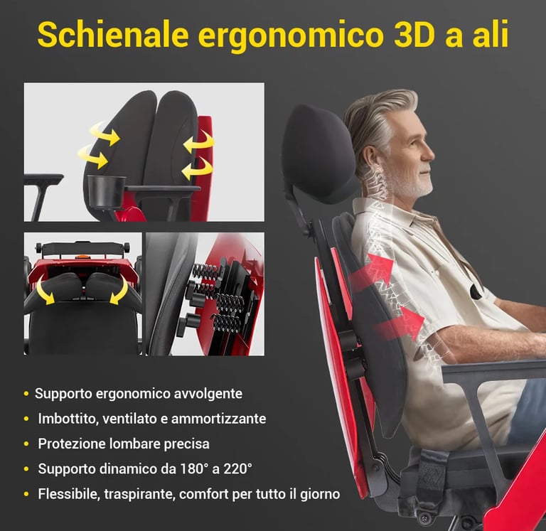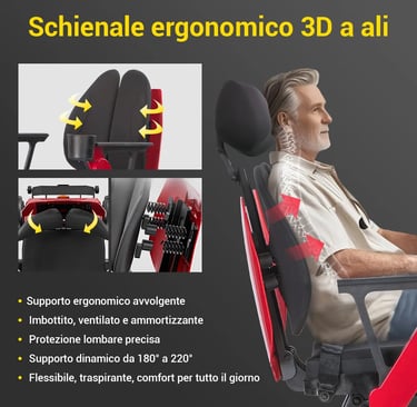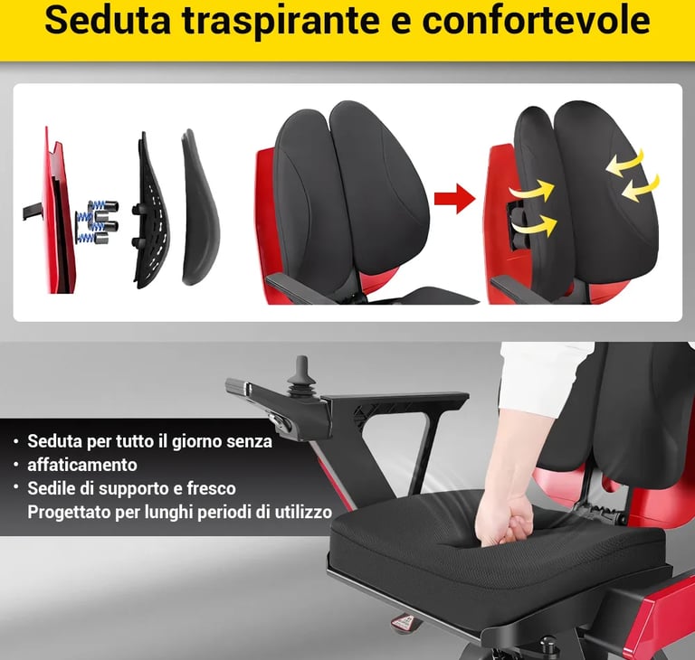 La seduta è pensata per offrire comfort e supporto durante l’utilizzo prolungato, con una struttura studiata per favorire una migliore traspirazione e una sensazione di maggiore comodità nel tempo.