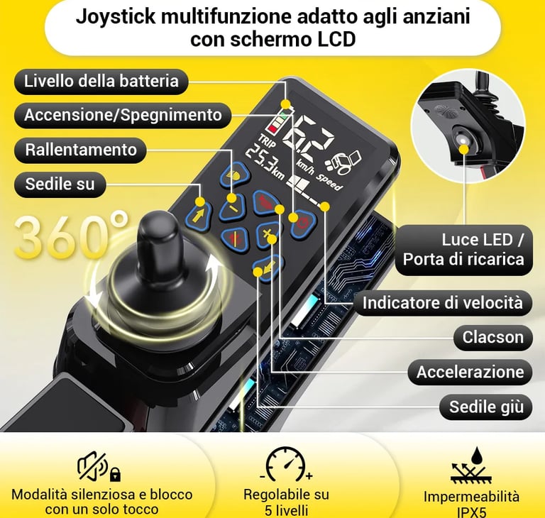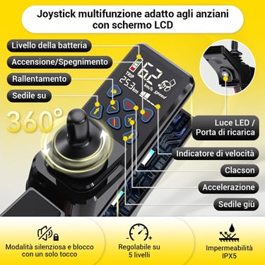 Joystick multifunzione con display LCD pensato per rendere più chiara la gestione delle funzioni principali durante l’uso quotidiano.