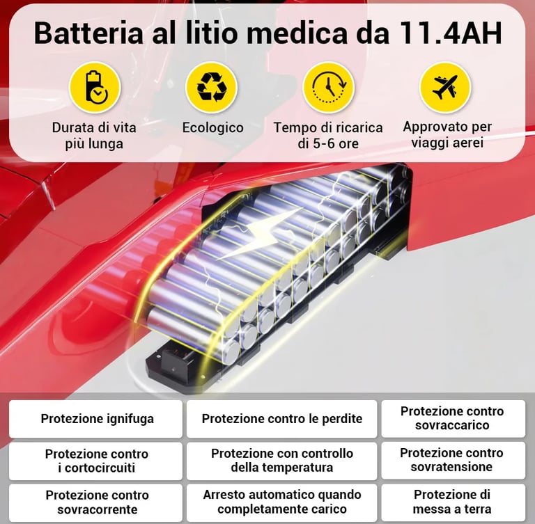 Ricarica rapida in 5–6 ore con tecnologia sicura e certificata.